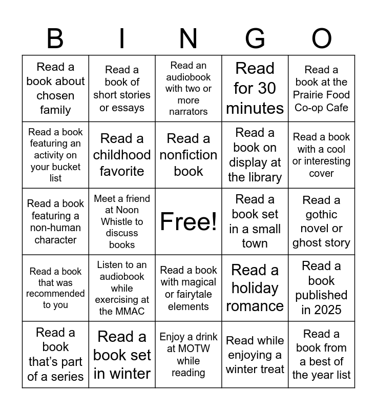 This bingo card has a free space and 24 words: Listen to an audiobook while exercising at the MMAC, Read a book set in winter, Read a nonfiction book, Read a book that’s part of a series, Read a book at the Prairie Food Co-op Cafe, Read a book about chosen family, Read a book featuring an activity on your bucket list, Read a book of short stories or essays, Read a book set in a small town, Read a book with magical or fairytale elements, Read a book on display at the library, Read a book featuring a non-human character, Read a holiday romance, Read a book published in 2025, Read a childhood favorite, Read while enjoying a winter treat, Read a gothic novel or ghost story, Read an audiobook with two or more narrators, Read a book with a cool or interesting cover, Meet a friend at Noon Whistle to discuss books, Read a book from a best of the year list, Read a book that was recommended to you, Read for 30 minutes and Enjoy a drink at MOTW while reading.