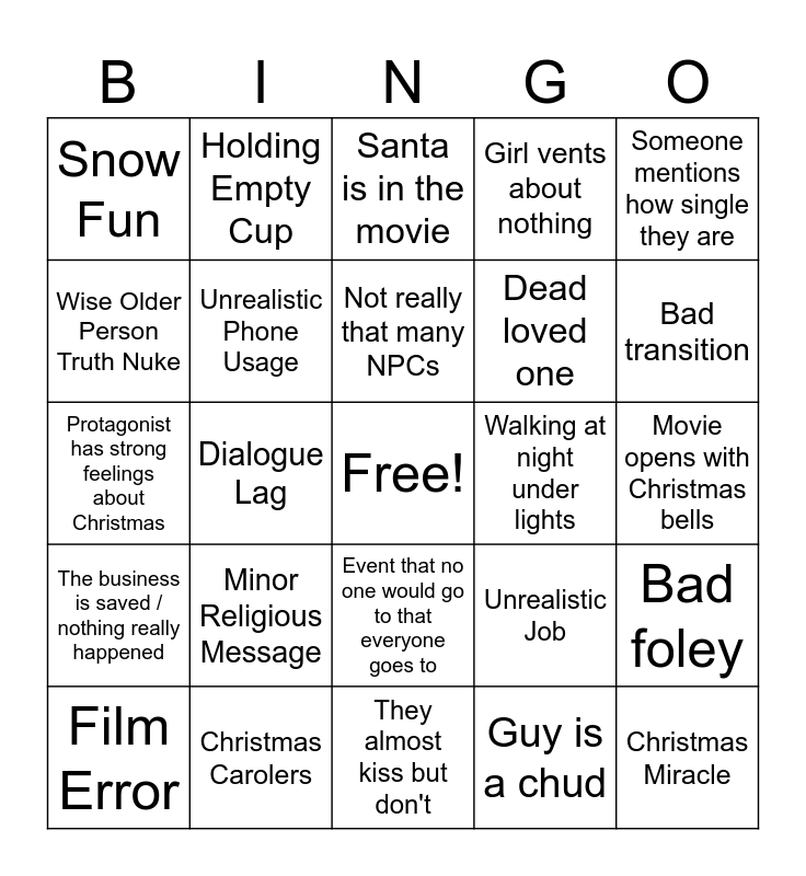 This bingo card has a free space and 24 words: Minor Religious Message, Christmas Carolers, Not really that many NPCs, Film Error, Someone mentions how single they are, Snow Fun, Wise Older Person Truth Nuke, Holding Empty Cup, Walking at night under lights, Event that no one would go to that everyone goes to, Dead loved one, Protagonist has strong feelings about Christmas, Unrealistic Job, Bad foley, Unrealistic Phone Usage, Guy is a chud, Movie opens with Christmas bells, Santa is in the movie, Bad transition, Dialogue Lag, Christmas Miracle, The business is saved / nothing really happened, Girl vents about nothing and They almost kiss but don't.