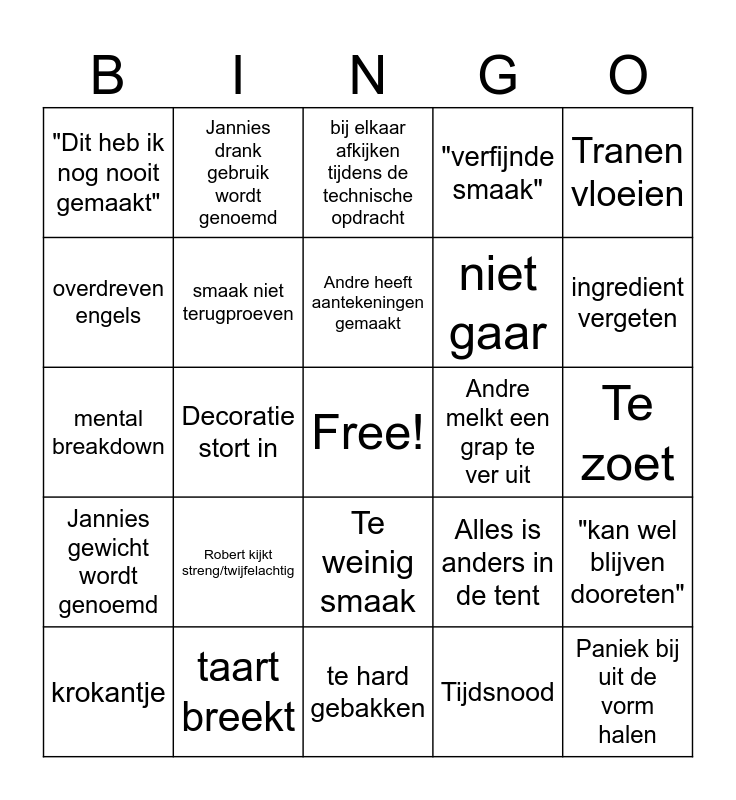 This bingo card has a free space and 27 words: Alles is anders in de tent, Vulling loopt weg, niet gaar, te hard gebakken, overdreven engels, bij elkaar afkijken tijdens de technische opdracht, Jannies drank gebruik wordt genoemd, Jannies gewicht wordt genoemd, Andre melkt een grap te ver uit, "kan wel blijven dooreten", mental breakdown, "verfijnde smaak", krokantje, taart breekt, ingredient vergeten, opnieuw moeten maken, smaak niet terugproeven, Andre heeft aantekeningen gemaakt, Robert kijkt streng/twijfelachtig, "Dit heb ik nog nooit gemaakt", Te zoet, Tijdsnood, Decoratie stort in, Paniek bij uit de vorm halen, Te weinig smaak, Tranen vloeien and Taart die een kleuter mooier had kunnen maken.