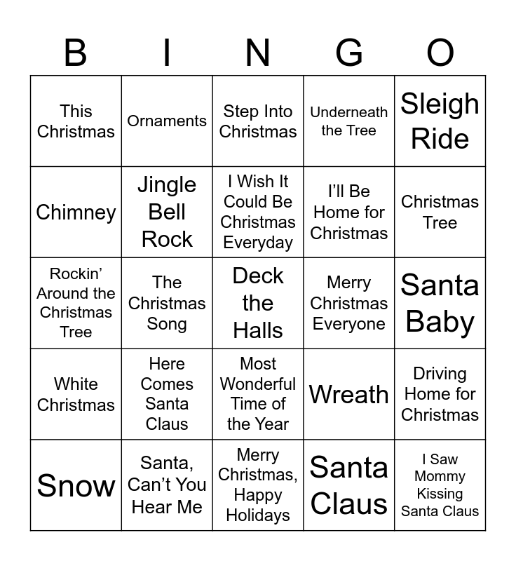 This bingo card has 41 words: All I Want for Christmas is You, Rockin’ Around the Christmas Tree, Last Christmas, Jingle Bell Rock, Santa, Can’t You Hear Me, Most Wonderful Time of the Year, I Wish It Could Be Christmas Everyday, Let It Snow! Let It Snow! Let It Snow!, Sleigh Ride, White Christmas, The Christmas Song, Underneath the Tree, Deck the Halls, Santa Baby, Merry Christmas Everyone, Here Comes Santa Claus, Winter Wonderland, This Christmas, Have Yourself a Merry Little Christmas, Step Into Christmas, Driving Home for Christmas, I Saw Mommy Kissing Santa Claus, Merry Christmas, Happy Holidays, I’ll Be Home for Christmas, Frosty the Snowman, Rudolph the Red Nosed Reindeer, Santa Claus, Mrs Claus, Christmas Tree, Tinsel, Bells, Ornaments, Snow, Christmas Lights, Wreath, Chimney, Stocking, Mistletoe, Elves, Santa’s Workshop and Winter.