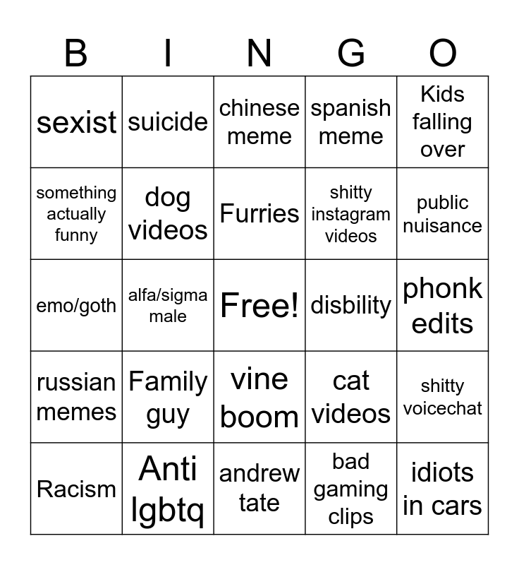 This bingo card has a free space and 24 words: Family guy, Anti lgbtq, Furries, Racism, Kids falling over, sexist, something actually funny, suicide, disbility, vine boom, shitty instagram videos, emo/goth, cat videos, shitty voicechat, dog videos, bad gaming clips, phonk edits, chinese meme, public nuisance, alfa/sigma male, idiots in cars, russian memes, spanish meme and andrew tate.