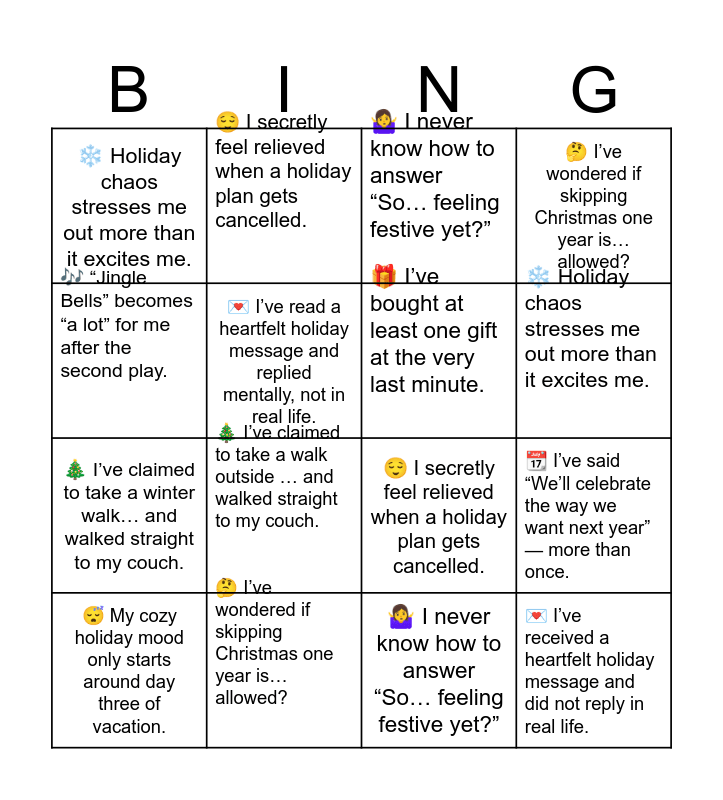 This bingo card has 33 words: Free!, 🥶 I’ve avoided outdoor events because “it’s too cold.”, 📆 I’ve said “We’ll celebrate the way we want next year” — more than once., 📱 I’ve watched a Christmas movie… while scrolling my phone., 💌 I’ve received a heartfelt holiday message and did not reply in real life., 🎁 I’ve bought at least one gift at the very last minute., 🎶 “Jingle Bells” becomes “a lot” for me after the second play., 🍪 I’ve eaten holiday treats before the holidays officially started., 😌 I secretly feel relieved when a holiday plan gets cancelled., 🌲 I’ve had the thought: “Maybe we skip decorations this year?”, ❄️ Holiday chaos stresses me out more than it excites me., 🤷♀️ I never know how to answer “So… feeling festive yet?”, 🙅I’ve pretended to be “so busy” to avoid a holiday activity., 😴 My cozy holiday mood only starts around day three of vacation., 🤔 I’ve wondered if skipping Christmas one year is… allowed?, 🎄 I’ve claimed to take a walk outside … and walked straight to my couch., 🐶 I know someone named Max., 😌 I secretly feel relieved when a holiday plan gets cancelled., 🎁 I’ve bought at least one gift at the very last minute., 🎶 “Jingle Bells” becomes “a lot” for me after the second play., 🍪 I’ve eaten holiday treats before the holidays officially started., 🌲 I’ve had the thought: “Maybe we skip decorations this year?”, ❄️ Holiday chaos stresses me out more than it excites me., 🤷♀️ I never know how to answer “So… feeling festive yet?”, 🙅I’ve pretended to be “so busy” to avoid a holiday activity., 😴 My cozy holiday mood only starts around day three of vacation., 🤔 I’ve wondered if skipping Christmas one year is… allowed?, 🎄 I’ve claimed to take a winter walk… and walked straight to my couch., 💌 I’ve read a heartfelt holiday message and replied mentally, not in real life., 📱 I’ve watched a Christmas movie… while scrolling my phone., 📆 I’ve said “We’ll celebrate properly next year” — more than once., 🥶 I’ve avoided outdoor events because “it’s too cold.” and 🐶 I know someone named Max..