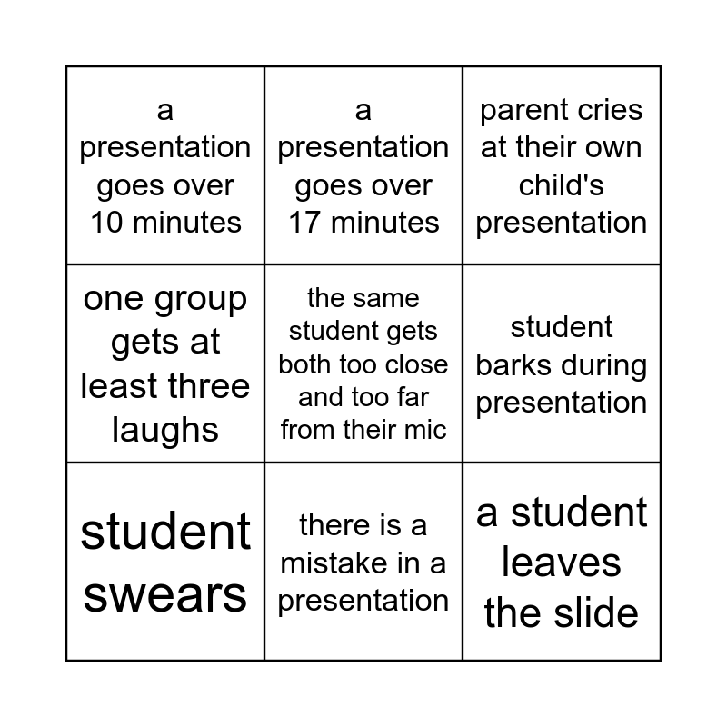 This bingo card has a free space and 8 words: student barks during presentation, parent cries at their own child's presentation, a presentation goes over 17 minutes, student swears, a presentation goes over 10 minutes, a student leaves the slide, one group gets at least three laughs and there is a mistake in a presentation.