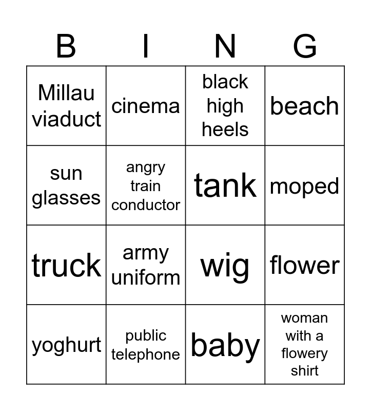 This bingo card has 25 words: yellow mini, bus ticket, moped, chickens, sun glasses, Millau viaduct, angry train conductor, cinema, public telephone, match sticks, truck, wig, guitar, waiter, tank, opera, baby, black high heels, army uniform, flower, yoghurt, hotel cleaner, woman with a flowery shirt, beach and surfboard.