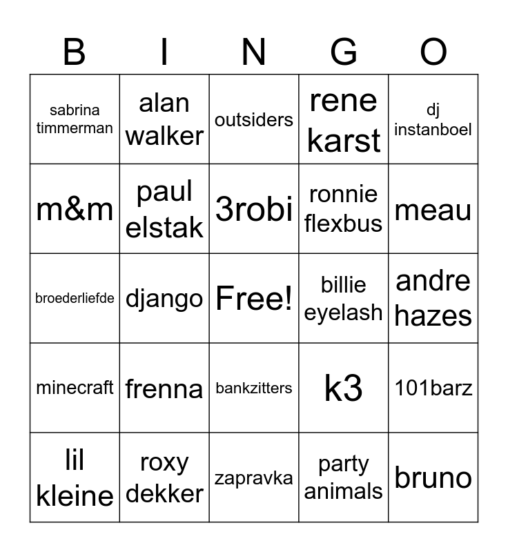 This bingo card has a free space and 24 words: frenna, roxy dekker, 3robi, lil kleine, dj instanboel, sabrina timmerman, m&m, alan walker, billie eyelash, bankzitters, ronnie flexbus, broederliefde, k3, 101barz, paul elstak, party animals, andre hazes, outsiders, meau, django, bruno, minecraft, rene karst and zapravka.