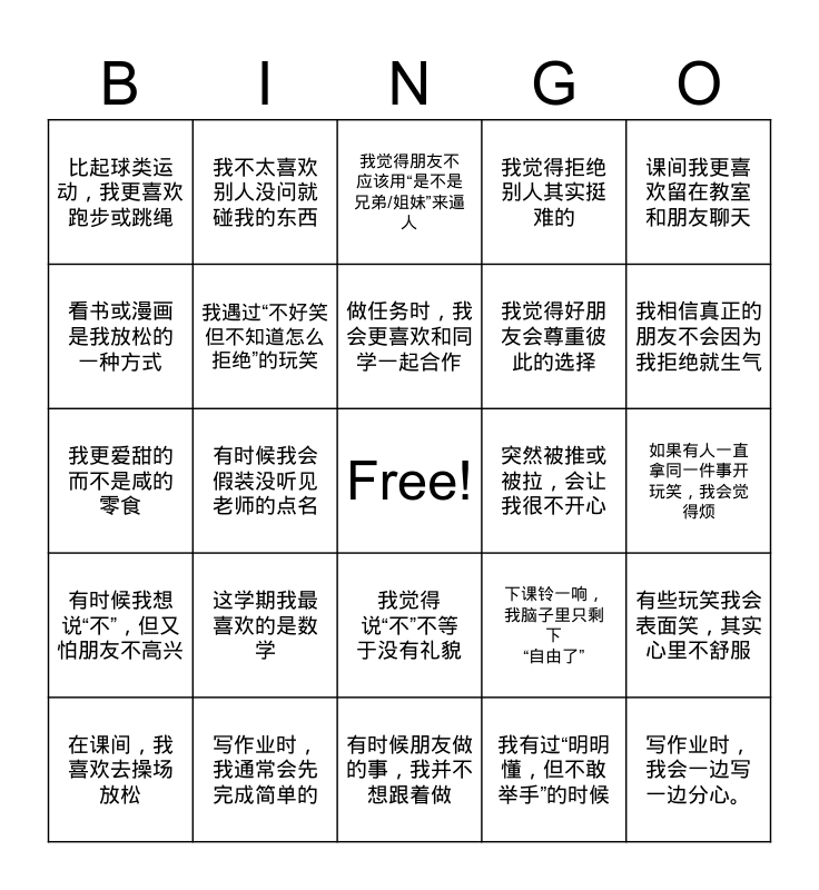 This bingo card has a free space and 24 words: 这学期我最喜欢的是数学, 写作业时,我通常会先完成简单的, 做任务时,我会更喜欢和同学一起合作, 在课间,我喜欢去操场放松, 课间我更喜欢留在教室和朋友聊天, 比起球类运动,我更喜欢跑步或跳绳, 看书或漫画是我放松的一种方式, 我不太喜欢别人没问就碰我的东西, 突然被推或被拉,会让我很不开心, 我觉得说“不”不等于没有礼貌, 我觉得好朋友会尊重彼此的选择, 我更爱甜的而不是咸的零食, 下课铃一响,我脑子里只剩下 “自由了”, 有些玩笑我会表面笑,其实心里不舒服, 我遇过“不好笑但不知道怎么拒绝”的玩笑, 我有过“明明懂,但不敢举手”的时候, 如果有人一直拿同一件事开玩笑,我会觉得烦, 我觉得朋友不应该用“是不是兄弟/姐妹”来逼人, 我相信真正的朋友不会因为我拒绝就生气, 有时候我会假装没听见老师的点名, 写作业时,我会一边写一边分心。, 有时候我想说“不”,但又怕朋友不高兴, 我觉得拒绝别人其实挺难的 and 有时候朋友做的事,我并不想跟着做.