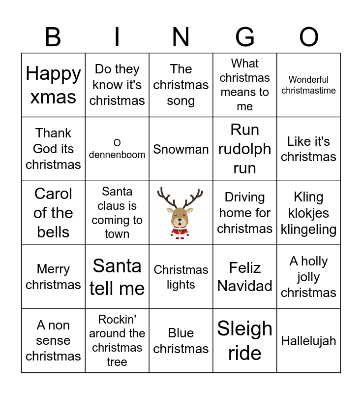 This bingo card has a free space and 24 words: Santa tell me, Rockin' around the christmas tree, Snowman, A non sense christmas, Wonderful christmastime, Happy xmas, Thank God its christmas, Do they know it's christmas, Driving home for christmas, Christmas lights, Run rudolph run, Carol of the bells, Feliz Navidad, A holly jolly christmas, O dennenboom, Sleigh ride, Kling klokjes klingeling, The christmas song, Like it's christmas, Santa claus is coming to town, Hallelujah, Merry christmas, What christmas means to me and Blue christmas.