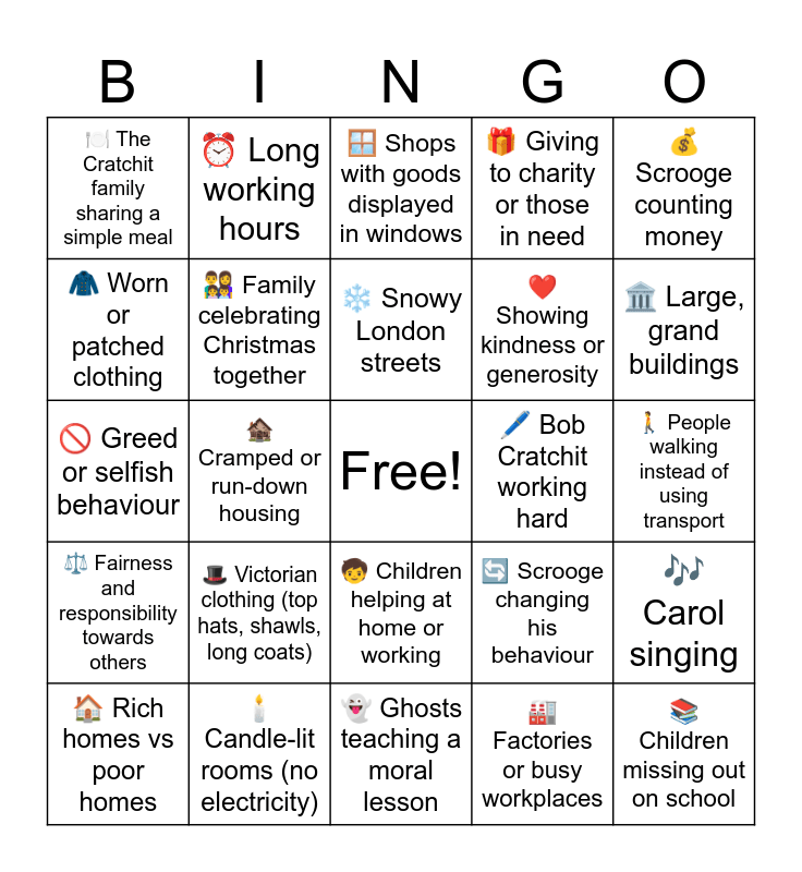 This bingo card has a free space and 24 words: ๐ฉ Victorian clothing (top hats, shawls, long coats), ๐ฏ๏ธ Candle-lit rooms (no electricity), โ๏ธ Snowy London streets, ๐ Rich homes vs poor homes, ๐ฐ Scrooge counting money, ๐ฝ๏ธ The Cratchit family sharing a simple meal, ๐งฅ Worn or patched clothing, โฐ Long working hours, ๐๏ธ Bob Cratchit working hard, ๐ง Children helping at home or working, โค๏ธ Showing kindness or generosity, ๐ซ Greed or selfish behaviour, ๐ Scrooge changing his behaviour, ๐ถ Carol singing, ๐จโ๐ฉโ๐งโ๐ฆ Family celebrating Christmas together, ๐ญ Factories or busy workplaces, ๐ถ People walking instead of using transport, ๐ช Shops with goods displayed in windows, ๐๏ธ Large, grand buildings, ๐๏ธ Cramped or run-down housing, ๐ Children missing out on school, โ๏ธ Fairness and responsibility towards others, ๐ Giving to charity or those in need and ๐ป Ghosts teaching a moral lesson.