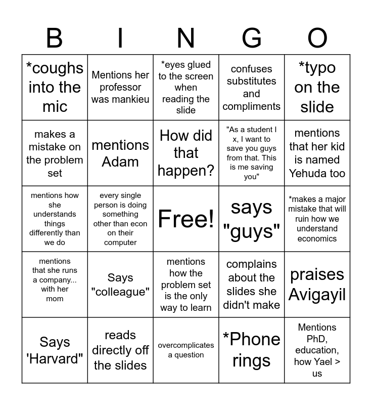 This bingo card has a free space and 24 words: Says 'Harvard", Says "colleague", How did that happen?, *Phone rings, *typo on the slide, *coughs into the mic, Mentions her professor was mankieu, *eyes glued to the screen when reading the slide, says "guys", *makes a major mistake that will ruin how we understand economics, mentions how she understands things differently than we do, mentions Adam, complains about the slides she didn't make, praises Avigayil, makes a mistake on the problem set, reads directly off the slides, overcomplicates a question, confuses substitutes and compliments, mentions that her kid is named Yehuda too, mentions that she runs a company... with her mom, every single person is doing something other than econ on their computer, mentions how the problem set is the only way to learn, "As a student I x, I want to save you guys from that. This is me saving you" and Mentions PhD, education, how Yael > us.