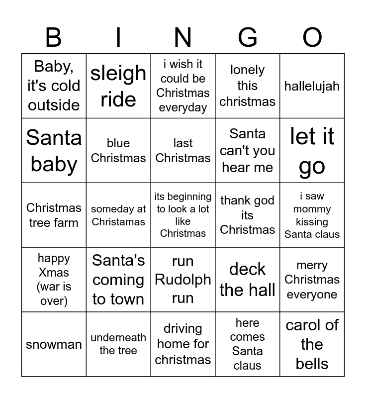 This bingo card has a free space and 24 words: Santa's coming to town, underneath the tree, last Christmas, snowman, hallelujah, Baby, it's cold outside, Santa baby, sleigh ride, thank god its Christmas, run Rudolph run, Santa can't you hear me, Christmas tree farm, deck the hall, merry Christmas everyone, blue Christmas, here comes Santa claus, i saw mommy kissing Santa claus, i wish it could be Christmas everyday, let it go, someday at Christamas, carol of the bells, happy Xmas (war is over), lonely this christmas and driving home for christmas.