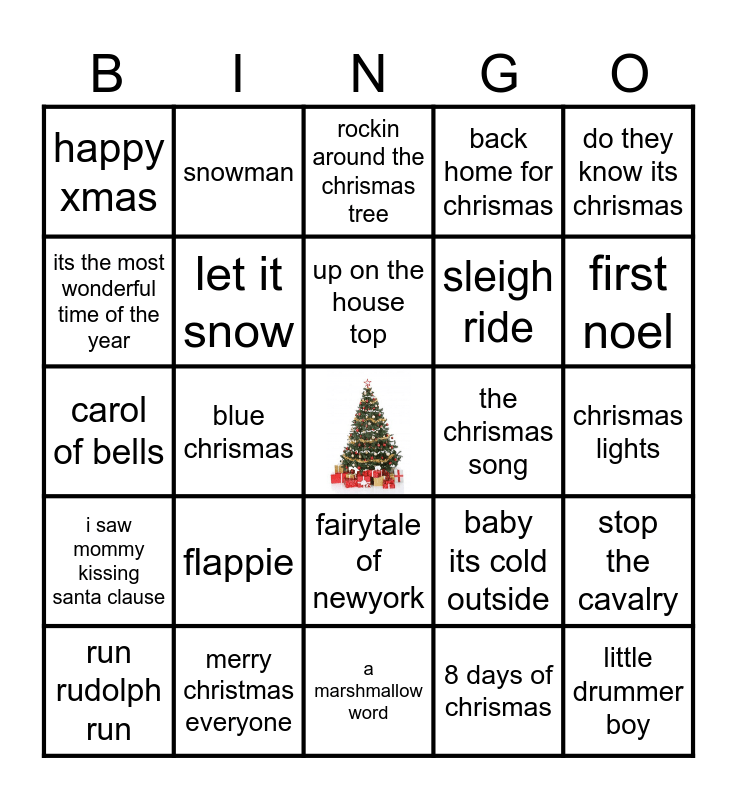 This bingo card has a free space and 24 words: flappie, merry christmas everyone, up on the house top, run rudolph run, do they know its chrismas, happy xmas, its the most wonderful time of the year, snowman, the chrismas song, fairytale of newyork, sleigh ride, carol of bells, baby its cold outside, stop the cavalry, let it snow, 8 days of chrismas, chrismas lights, rockin around the chrismas tree, first noel, blue chrismas, little drummer boy, i saw mommy kissing santa clause, back home for chrismas and a marshmallow word.