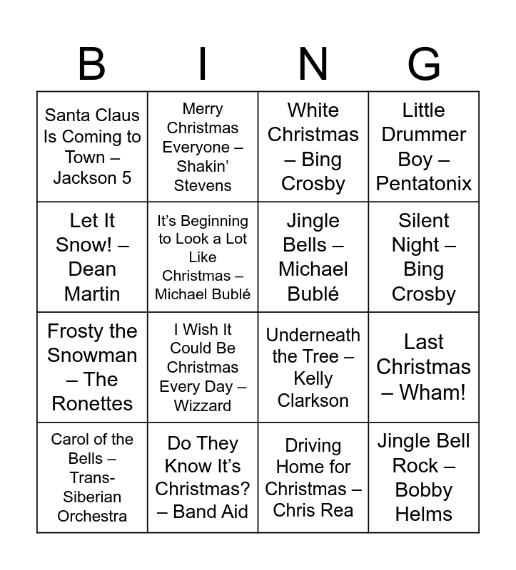 This bingo card has 32 words: Free!, All I Want for Christmas Is You – Mariah Carey, Last Christmas – Wham!, Rockin’ Around the Christmas Tree – Brenda Lee, Jingle Bell Rock – Bobby Helms, Jingle Bells – Michael Bublé, Let It Snow! – Dean Martin, Step Into Christmas – Elton John, Merry Christmas Everyone – Shakin’ Stevens, Feliz Navidad – José Feliciano, Silent Night – Bing Crosby, White Christmas – Bing Crosby, Winter Wonderland – Tony Bennett, Fairytale of New York – The Pogues, Do They Know It’s Christmas? – Band Aid, Santa Baby – Eartha Kitt, Santa Tell Me – Ariana Grande, Underneath the Tree – Kelly Clarkson, Mistletoe – Justin Bieber, Have Yourself a Merry Little Christmas – Frank Sinatra, Sleigh Ride – The Ronettes, Deck the Halls – Mannheim Steamroller, Driving Home for Christmas – Chris Rea, Holly Jolly Christmas – Michael Bublé, Carol of the Bells – Trans-Siberian Orchestra, Little Drummer Boy – Pentatonix, Frosty the Snowman – The Ronettes, It’s Beginning to Look a Lot Like Christmas – Michael Bublé, Santa Claus Is Coming to Town – Jackson 5, Christmas Lights – Coldplay, Silver Bells – Bing Crosby and I Wish It Could Be Christmas Every Day – Wizzard.
