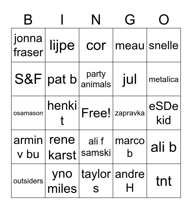 This bingo card has a free space and 24 words: rene karst, yno miles, party animals, outsiders, snelle, jonna fraser, S&F, lijpe, zapravka, ali f samski, jul, osamason, marco b, ali b, pat b, andre H, eSDe kid, cor, metalica, henki t, tnt, armin v bu, meau and taylor s.