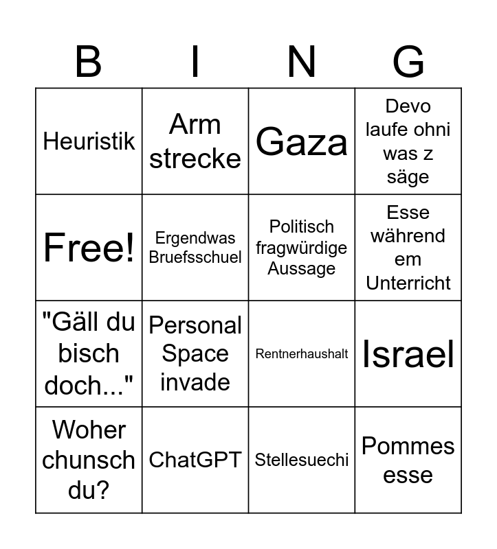 This bingo card has 16 words: ChatGPT, Israel, Gaza, Heuristik, "Gäll du bisch doch...", Arm strecke, Rentnerhaushalt, Stellesuechi, Free!, Ergendwas Bruefsschuel, Woher chunsch du?, Devo laufe ohni was z säge, Personal Space invade, Esse während em Unterricht, Politisch fragwürdige Aussage and Pommes esse.