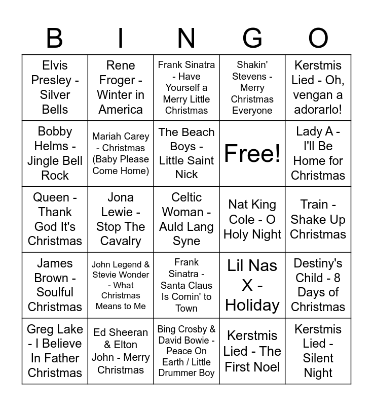 This bingo card has 159 words: Andre Hazes - Eenzame kerst, Kerstmis Lied - Jingle Bells, Kerstmis Lied - We Wish You a Merry Christmas, Kerstmis Lied - O Tannenbaum, Kerstmis Lied - Rudolph the Red Nosed Reindeer, Kerstmis Lied - Stille Nacht, Heilige Nacht, Kerstmis Lied - Winter Wonderland, Henri Salvador - Vive le vent, Wham! - Last Christmas, Mud - Lonely This Christmas, Nat King Cole - O Holy Night, Mariah Carey - All I Want for Christmas Is You, Free!, Chris Rea - Driving Home for Christmas, Frank Sinatra - Santa Claus Is Comin' to Town, Queen - Thank God It's Christmas, Coldplay - Christmas Lights, Kelly Clarkson - Underneath the Tree, Jose Feliciano - Feliz Navidad, Ariana Grande - Santa Tell Me, John Legend & Stevie Wonder - What Christmas Means to Me, Justin Bieber - Mistletoe, Lady A - I'll Be Home for Christmas, Train - Shake Up Christmas, Kerstmis Lied - Joy to the World, Lisa Lois - Hallelujah, Destiny's Child - 8 Days of Christmas, Lil Nas X - Holiday, Andy Williams - It's the Most Wonderful Time of the Year, Frank Sinatra - Have Yourself a Merry Little Christmas, The Ronettes - Sleigh Ride, Miss Montreal - Being Alone at Christmas, Ed Sheeran & Elton John - Merry Christmas, Sarah McLachlan - Happy Xmas (War Is Over), Bryan Adams - Christmas Time, Amy Grant - Rockin' Around the Christmas Tree, Celine Dion - I Met an Angel (On Christmas Day), Dean Martin - Let It Snow! Let It Snow! Let It Snow!, Bing Crosby & The Puppini Sisters - The Twelve Days of Christmas, Britney Spears - My Only Wish (This Year), Gwen Stefani & Blake Shelton - You Make It Feel Like Christmas, Youp van 't Hek - Flappie, Kerstmis Lied - Silent Night, Robbie Williams & Tyson Fury - Bad Sharon, Elvis Presley - Silver Bells, Band Aid - Do They Know It's Christmas?, Juanes - El Burrito de Belen, Rolf Zuckowski - In der Weihnachtsbackerei, Celine Dion - Christmas Eve, Kelly Clarkson & Ariana Grande - Santa, Can't You Hear Me, Bing Crosby - White Christmas, Bing Crosby & David Bowie - Peace On Earth / Little Drummer Boy, Dana Rosemary Scallon - It's Gonna Be a Cold, Cold Christmas, Bobby Helms - Jingle Bell Rock, Christina Aguilera - This Christmas, Greg Lake - I Believe In Father Christmas, Tino Rossi - Petit Papa Noel, Rene Froger - Winter in America, Kerstmis Lied - O Come, O Come, Emmanuel, Kerstmis Lied - O Little Town of Bethlehem, Kerstmis Lied - Oh, vengan a adorarlo!, Celtic Woman - Auld Lang Syne, Kerstmis Lied - The First Noel, Shania Twain - God Bless the Child, Shakin' Stevens - Merry Christmas Everyone, Jona Lewie - Stop The Cavalry, Andrea Bocelli & Matteo Bocelli, Virginia Bocelli & David Swinson - Away in a Manger, Andy Williams - The Little Drummer Boy, Michael Buble & The Puppini Sisters - Frosty the Snowman, Mariah Carey - Christmas (Baby Please Come Home), Frank Sinatra - I Saw Mommy Kissing Santa Claus, Kerstmis Lied - We Three Kings, The Beach Boys - Little Saint Nick, Michael Buble & The Puppini Sisters - Ave Maria, Frank Sinatra - Mistletoe and Holly, Bing Crosby & The Andrews Sisters - Mele Kalikimaka, James Brown - Soulful Christmas, Idina Menzel & Michael Buble - Baby It's Cold Outside, Madonna - Santa Baby, Paul Mccartney - Wonderful Christmas Time, Andre Hazes - Eenzame kerst, Kerstmis Lied - Jingle Bells, Kerstmis Lied - We Wish You a Merry Christmas, Kerstmis Lied - O Tannenbaum, Kerstmis Lied - Rudolph the Red Nosed Reindeer, Kerstmis Lied - Stille Nacht, Heilige Nacht, Kerstmis Lied - Winter Wonderland, Henri Salvador - Vive le vent, Wham! - Last Christmas, Mud - Lonely This Christmas, Nat King Cole - O Holy Night, Mariah Carey - All I Want for Christmas Is You, Chris Rea - Driving Home for Christmas, Frank Sinatra - Santa Claus Is Comin' to Town, Queen - Thank God It's Christmas, Coldplay - Christmas Lights, Kelly Clarkson - Underneath the Tree, Jose Feliciano - Feliz Navidad, Ariana Grande - Santa Tell Me, John Legend & Stevie Wonder - What Christmas Means to Me, Justin Bieber - Mistletoe, Lady A - I'll Be Home for Christmas, Train - Shake Up Christmas, Kerstmis Lied - Joy to the World, Lisa Lois - Hallelujah, Destiny's Child - 8 Days of Christmas, Lil Nas X - Holiday, Andy Williams - It's the Most Wonderful Time of the Year, Frank Sinatra - Have Yourself a Merry Little Christmas, The Ronettes - Sleigh Ride, Miss Montreal - Being Alone at Christmas, Ed Sheeran & Elton John - Merry Christmas, Sarah McLachlan - Happy Xmas (War Is Over), Bryan Adams - Christmas Time, Amy Grant - Rockin' Around the Christmas Tree, Celine Dion - I Met an Angel (On Christmas Day), Dean Martin - Let It Snow! Let It Snow! Let It Snow!, Bing Crosby & The Puppini Sisters - The Twelve Days of Christmas, Britney Spears - My Only Wish (This Year), Gwen Stefani & Blake Shelton - You Make It Feel Like Christmas, Youp van 't Hek - Flappie, Kerstmis Lied - Silent Night, Robbie Williams & Tyson Fury - Bad Sharon, Elvis Presley - Silver Bells, Band Aid - Do They Know It's Christmas?, Juanes - El Burrito de Belen, Rolf Zuckowski - In der Weihnachtsbackerei, Celine Dion - Christmas Eve, Kelly Clarkson & Ariana Grande - Santa, Can't You Hear Me, Bing Crosby - White Christmas, Bing Crosby & David Bowie - Peace On Earth / Little Drummer Boy, Dana Rosemary Scallon - It's Gonna Be a Cold, Cold Christmas, Bobby Helms - Jingle Bell Rock, Christina Aguilera - This Christmas, Greg Lake - I Believe In Father Christmas, Tino Rossi - Petit Papa Noel, Rene Froger - Winter in America, Kerstmis Lied - O Come, O Come, Emmanuel, Kerstmis Lied - O Little Town of Bethlehem, Kerstmis Lied - Oh, vengan a adorarlo!, Celtic Woman - Auld Lang Syne, Kerstmis Lied - The First Noel, Shania Twain - God Bless the Child, Shakin' Stevens - Merry Christmas Everyone, Jona Lewie - Stop The Cavalry, Andrea Bocelli & Matteo Bocelli, Virginia Bocelli & David Swinson - Away in a Manger, Andy Williams - The Little Drummer Boy, Michael Buble & The Puppini Sisters - Frosty the Snowman, Mariah Carey - Christmas (Baby Please Come Home), Frank Sinatra -
