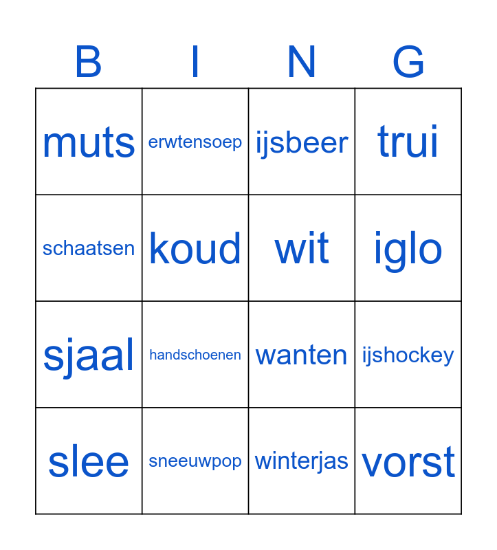 This bingo card has 20 words: ijshockey, winterpret, ijsbeer, chocolademelk, slee, schaatsen, sneeuwpop, muts, sjaal, erwtensoep, handschoenen, wanten, koud, vorst, wit, sneeuwschoenen, iglo, trui, winterjas and ijsbaan.
