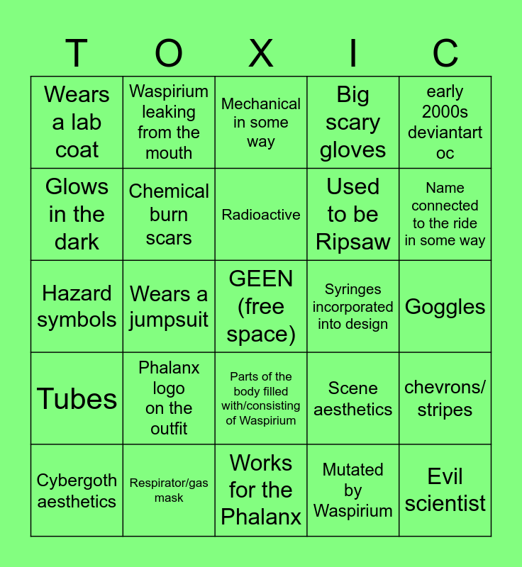 This bingo card has a free space and 24 words: Phalanx logo on the outfit, Respirator/gas mask, Radioactive, Cybergoth aesthetics, early 2000s deviantart oc, Wears a lab coat, Glows in the dark, Waspirium leaking from the mouth, Syringes incorporated into design, Parts of the body filled with/consisting of Waspirium, Used to be Ripsaw, Hazard symbols, Scene aesthetics, chevrons/ stripes, Chemical burn scars, Mutated by Waspirium, Goggles, Mechanical in some way, Name connected to the ride in some way, Wears a jumpsuit, Evil scientist, Tubes, Big scary gloves and Works for the Phalanx.