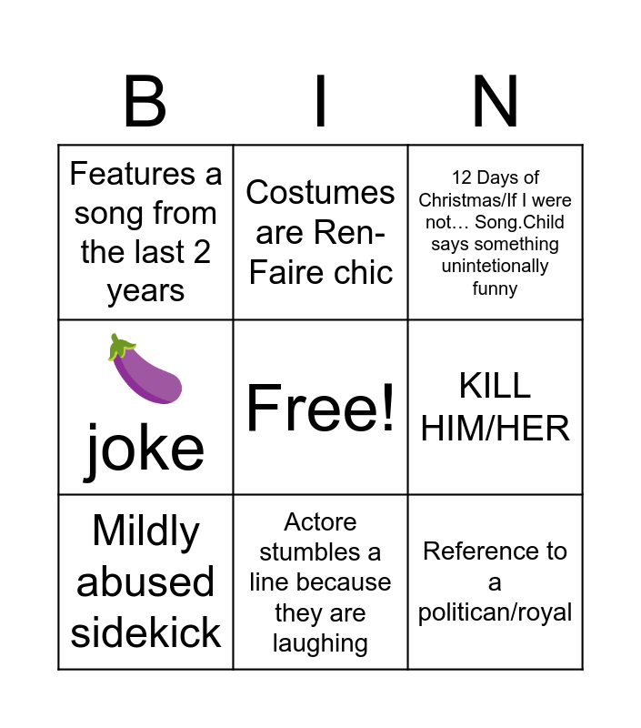 This bingo card has a free space and 8 words: KILL HIM/HER, 12 Days of Christmas/If I were not… Song.Child says something unintetionally funny, Costumes are Ren-Faire chic, Mildly abused sidekick, Features a song from the last 2 years, Reference to a politican/royal, 🍆 joke and Actore stumbles a line because they are laughing.