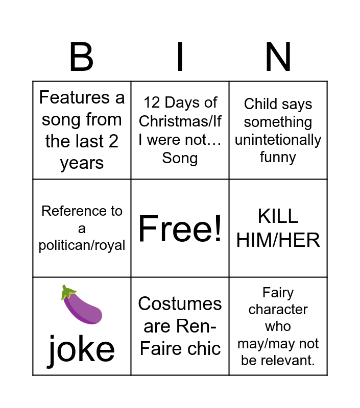 This bingo card has a free space and 12 words: The costumes from the poster are NOWHERE to be seen., One child doesn’t get a goodie bag, Fairy character who may/may not be relevant., KILL HIM/HER, 12 Days of Christmas/If I were not… Song, Child says something unintetionally funny, Costumes are Ren-Faire chic, Mildly abused sidekick, Features a song from the last 2 years, Reference to a politican/royal, 🍆 joke and Actor stumbles a line because they are laughing.