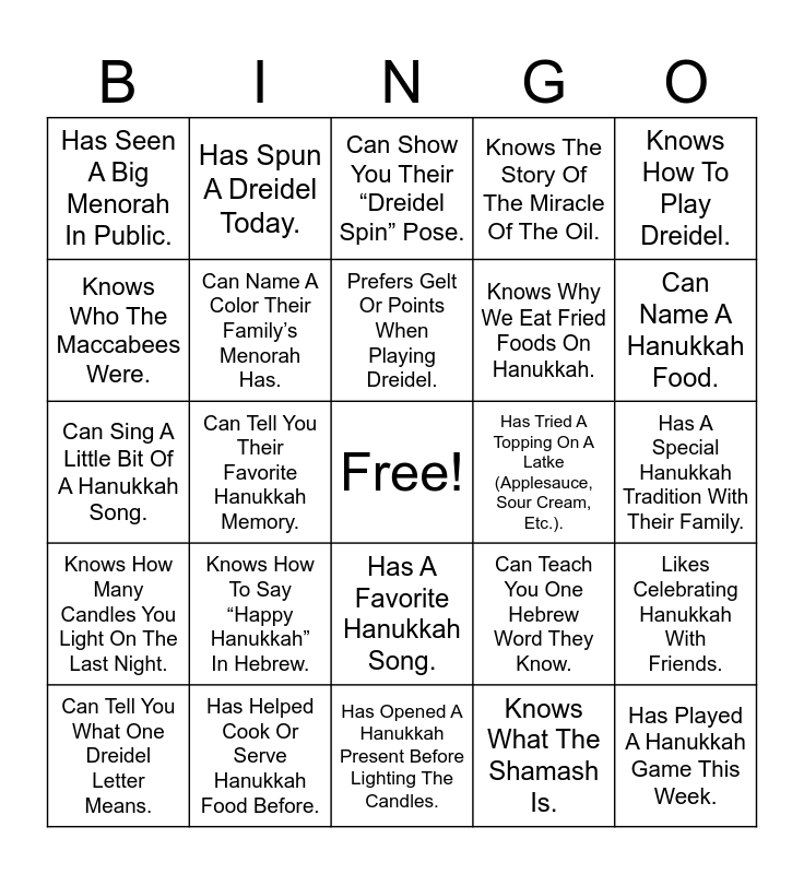 This bingo card has a free space and 34 words: Has Lit A Menorah This Hanukkah., Knows What The Shamash Is., Can Show You How To “Light” The Candles With Hand Motions., Can Tell You Which Candle Gets Lit First., Knows How Many Candles You Light On The Last Night., Can Name A Color Their Family’s Menorah Has., Knows How To Play Dreidel., Can Tell You What One Dreidel Letter Means., Has Spun A Dreidel Today., Can Spin A Dreidel For At Least 2 Seconds., Prefers Gelt Or Points When Playing Dreidel., Can Show You Their “Dreidel Spin” Pose., Likes Latkes., Likes Sufganiyot (Jelly Donuts)., Has Tried A Topping On A Latke (Applesauce, Sour Cream, Etc.)., Can Name A Hanukkah Food., Has Helped Cook Or Serve Hanukkah Food Before., Can Sing A Little Bit Of A Hanukkah Song., Knows How To Say “Happy Hanukkah” In Hebrew., Can Teach You One Hebrew Word They Know., Has A Favorite Hanukkah Song., Has A Favorite Night Of Hanukkah., Has Seen A Big Menorah In Public., Has A Special Hanukkah Tradition With Their Family., Has Opened A Hanukkah Present Before Lighting The Candles., Has Played A Hanukkah Game This Week., Knows The Story Of The Miracle Of The Oil., Can Name A Hanukkah Symbol (Dreidel, Menorah, Oil, Etc.)., Knows Why We Eat Fried Foods On Hanukkah., Knows Who The Maccabees Were., Can Show You An 8-Second Hanukkah Celebration Dance., Can Tell You Their Favorite Hanukkah Memory., Likes Celebrating Hanukkah With Friends. and Can Share One Thing That Brings “Light” To Others..