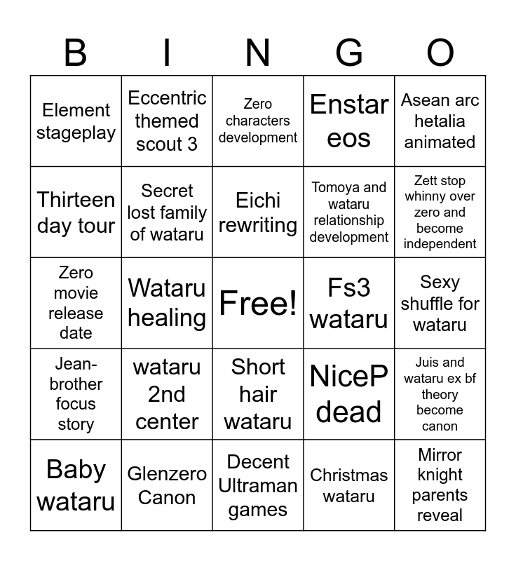 This bingo card has a free space and 24 words: wataru 2nd center, Glenzero Canon, Eichi rewriting, Baby wataru, Asean arc hetalia animated, Element stageplay, Thirteen day tour, Eccentric themed scout 3, Fs3 wataru, Short hair wataru, Tomoya and wataru relationship development, Zero movie release date, NiceP dead, Juis and wataru ex bf theory become canon, Secret lost family of wataru, Christmas wataru, Sexy shuffle for wataru, Zero characters development, Zett stop whinny over zero and become independent, Wataru healing, Mirror knight parents reveal, Jean-brother focus story, Enstar eos and Decent Ultraman games.