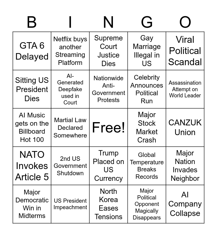 This bingo card has a free space and 24 words: 2nd US Government Shutdown, US President Impeachment, Nationwide Anti-Government Protests, Major Democratic Win in Midterms, Viral Political Scandal, GTA 6 Delayed, Sitting US President Dies, Netflix buys another Streaming Platform, Major Stock Market Crash, Trump Placed on US Currency, Celebrity Announces Political Run, AI Music gets on the Billboard Hot 100, Global Temperature Breaks Records, Major Nation Invades Neighbor, AI-Generated Deepfake used in Court, Major Political Opponent Magically Disappears, CANZUK Union, Supreme Court Justice Dies, Assassination Attempt on World Leader, Martial Law Declared Somewhere, AI Company Collapse, NATO Invokes Article 5, Gay Marriage Illegal in US and North Korea Eases Tensions.