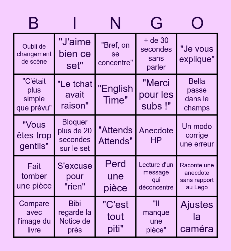 This bingo card has 60 words: Free!, Bibi regarde la Notice de près, "J'aime pas cette étape", Fait tomber une pièce, "Il manque une pièce", Le tchat sauve d'une erreur, "Le tchat avait raison", "J'aime vraiment une communauté géniale", "Merci pour les subs !", "Vous êtes des petits coeurs en chocolat pailletés", + de 30 secondes sans parler, Se rend compte qu'une étape a été sautée, "C'était plus simple que prévu", Souffle fort, Bug Technique, Oubli de changement de scène, "Attends Attends", "Je vous explique", "Trust the process", "English Time", Anecdote HP, "Bref, on se concentre", Compare avec l'image du livre, Raconte une anecdote sans rapport au Lego, Référence HP, Nom mal prononcé (pseudo), "C'est de la magiiiiie", Blague HP nulle (mais assumée), Bella passe dans le champs, Bibi parle à Bella, Bibi stoppe pour s'en occuper, Sourire à cause du chien, "Merci la modération", "Contente de faire ce live", "J'aime bien ce set", Complimente un Viewer, Montrer une pièce à la caméra, Bloquer plus de 20 secondes sur le set, Coeur avec les doigts Love Love, "Vous êtes trop gentils", "Merci pour le Follow", S'excuse pour "rien", Un modo corrige une erreur, Se félicite elle-même, Lecture d'un message qui déconcentre, Pièce au bon endroit ?, “Je demande confirmation au tchat”, “Je chuchote sans raison”, “Je parle toute seule”, Perd une pièce, "C'est tout piti", "J'ai besoin de votre avis", Un modo fait une blague nulle, Le chat te fait douter, Imites un perso HP (même très mal), Prend une voix bizarre, Chante, “ça valait le coup”, Ajustes la caméra and Fière du résultat.