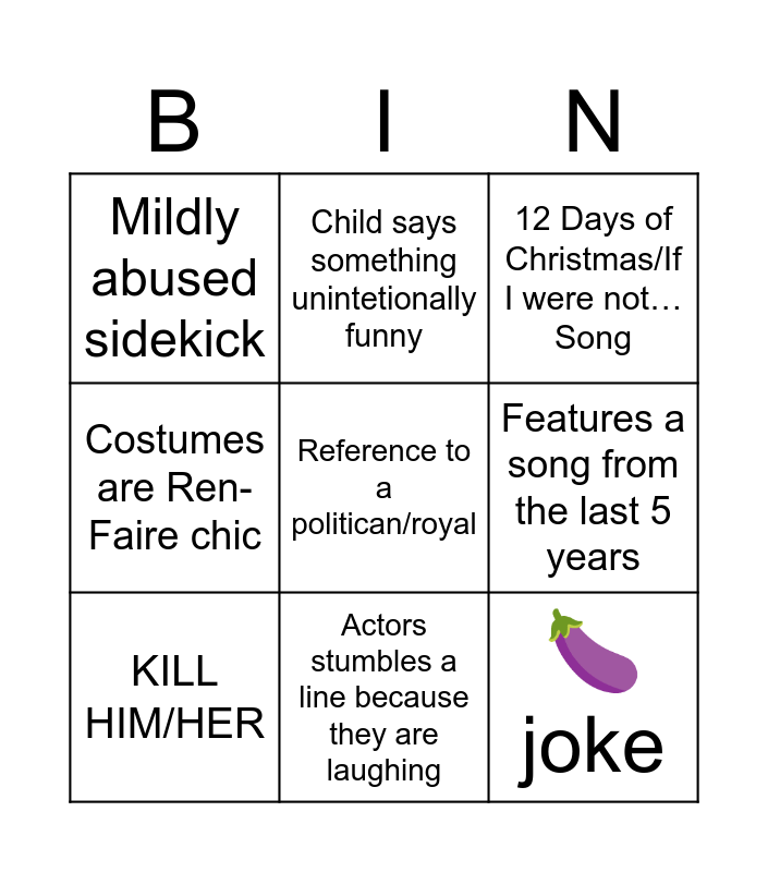 This bingo card has 9 words: KILL HIM/HER, 12 Days of Christmas/If I were not… Song, Child says something unintetionally funny, Costumes are Ren-Faire chic, Mildly abused sidekick, Features a song from the last 5 years, Reference to a politican/royal, 🍆 joke and Actors stumbles a line because they are laughing.