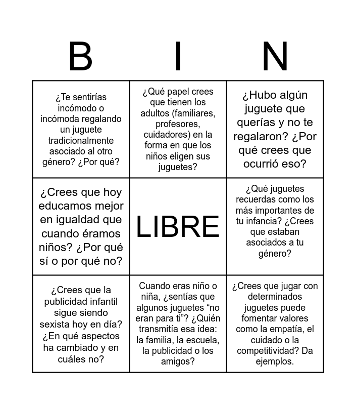 This bingo card has a free space and 8 words: ¿Qué juguetes recuerdas como los más importantes de tu infancia? ¿Crees que estaban asociados a tu género?, ¿Hubo algún juguete que querías y no te regalaron? ¿Por qué crees que ocurrió eso?, ¿Qué papel crees que tienen los adultos (familiares, profesores, cuidadores) en la forma en que los niños eligen sus juguetes?, ¿Crees que la publicidad infantil sigue siendo sexista hoy en día? ¿En qué aspectos ha cambiado y en cuáles no?, ¿Te sentirías incómodo o incómoda regalando un juguete tradicionalmente asociado al otro género? ¿Por qué?, ¿Crees que jugar con determinados juguetes puede fomentar valores como la empatía, el cuidado o la competitividad? Da ejemplos., ¿Crees que hoy educamos mejor en igualdad que cuando éramos niños? ¿Por qué sí o por qué no? and Cuando eras niño o niña, ¿sentías que algunos juguetes “no eran para ti”? ¿Quién transmitía esa idea: la familia, la escuela, la publicidad o los amigos?.
