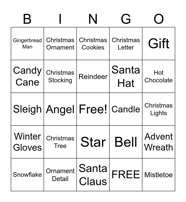 This bingo card has a free space and 25 words: Christmas Tree, Santa Claus, Reindeer, Snowflake, Gift, Gingerbread Man, Candy Cane, Christmas Ornament, Candle, Star, Santa Hat, Sleigh, Bell, Advent Wreath, Christmas Stocking, Snowman, Christmas Lights, Christmas Cookies, Hot Chocolate, Angel, Mistletoe, Ornament Detail, Winter Gloves, Christmas Letter and FREE.