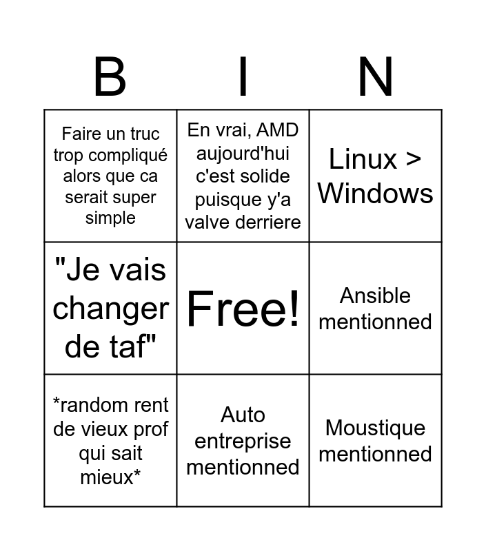 This bingo card has a free space and 8 words: Ansible mentionned, Linux > Windows, En vrai, AMD aujourd'hui c'est solide puisque y'a valve derriere, *random rent de vieux prof qui sait mieux*, Faire un truc trop compliqué alors que ca serait super simple, Moustique mentionned, "Je vais changer de taf" and Auto entreprise mentionned.