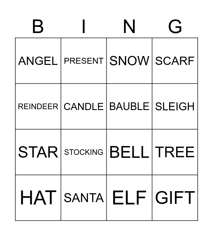 This bingo card has 16 words: SANTA, TREE, SNOW, ANGEL, STAR, PRESENT, BELL, ELF, REINDEER, CANDLE, HAT, SCARF, STOCKING, SLEIGH, BAUBLE and GIFT.