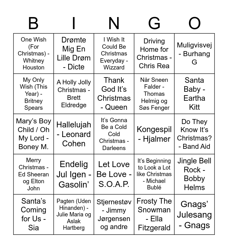 This bingo card has 88 words: Free!, Last Christmas - Wham!, Let Love Be Love - S.O.A.P., Merry Christmas Everyone - Shakin’Stevens, Julehjertets hemmelighed - Malte Ebert, All I Want for Christmas Is You - Mariah Carey, Tinka - Burhang G og Frida Brygmann, Valdes Jul - Christopher, I En Stjerneregn Af Sne - Mads Langer, Jesus & Josefine - Julie og Martin Brygmann, Let It Snow! Let It Snow! Let It Snow! - Dean Martin, It’s The Most Wonderful Time of the Year - Andy Williams, Jingle Bell Rock - Bobby Helms, Do They Know It’s Christmas? - Band Aid, Finally It’s Christmas Again - Youknowwho, Christina, Thank God It’s Christmas - Queen, Happy Xmas (War Is Over) - John Lennon, Yoko Ono, Jul På Vesterbro - Anders Mathhesen, Rockin’ Around The Christmas Tree - Brenda Lee, Jul i Angora - Drengene Fra Angora, It’s Hard to Be a Nissemand - De Nattergale, Feliz Navidad - José Feliciano, Mary’s Boy Child / Oh My Lord - Boney M., Wonderful Christmastime - Paul McCartney, Frosty The Snowman - Ella Fitzgerald, Silent Night - Frank Sinatra, Christmas (Baby Please Come Home) - Darlene Love, Baby It’s Cold Ouside - Ella Fitzgerald, White Christmas - Bing Crosby, 8 Days of Christmas - Destiny’s Child, I Wish It Could Be Christmas Everyday - Wizzard, Driving Home for Christmas - Chris Rea, Jul Det’ Cool - Mc Einar, Mistletoe - Justin Bieber, Endelig Jul Igen - Gasolin’, My Only Wish (This Year) - Britney Spears, One Wish (For Christmas) - Whitney Houston, It’s Beginning to Look a Lot Like Christmas - Perry Como, Have Yourself A Merry Little Christmas - Frank Sinatra, Santa Baby - Eartha Kitt, Hallelujah - Leonard Cohen, Der’ Noget I December - Rasmus Seebach, Santa Tell Me - Ariana Grande, It’s Beginning to Look a Lot like Christmas - Michael Bublé, Kongespil - Hjalmer, Rockin’ Around The Christmas Tree - Mel & Kim, Guld Jul - Gulddrenge, Lille Store Verden - Rasmus Seebach, Snowman - Sia, Når Sneen Falder - Thomas Helmig og Søs Fenger, Tidsrejsen - Caroline Castell, Sleigh Ride - The Ronettes, Koldt Udenfor - Page Four, Hey Mor - Joey Moe, Nu Er Det Jul - Burhang G, Den Himmelblå - Shu-Bi-Dua, Merry Christmas - Ed Sheeran og Elton John, Drømte Mig En Lille Drøm - Dicte, En Rigtig Drengejul - Rasmus Bjerg og Citybois, Ludvig Og Julemanden - Søs Fenger, Tag Mig Med - Mads Langer, Jul i Valhal - Martin Brygmann og Sarah West, Santa Claus Is Coming to Town - Michael Bublé, Merry Xmas Everybody - Slade, Winter Wonderland - Tony Bennett, Pagten (Uden Hinanden) - Julie Maria og Aslak Hartberg, Jeg Så Julemanden Kysse Mor - Burhang G, A Holly Jolly Christmas - Brett Eldredge, Santa’s Coming for Us - Sia, It’s Gonna Be a Cold Cold Christmas - Darleens, Gnags’ Julesang - Gnags, You Make It Feel Like Christmas - Gwen Stefani og Blake Shelton, I Saw Mommy Kissing Santa Claus - The Jackson 5, Muligvisvej - Burhang G, Så’ det jul - Kim Larsen, This Christmas - Christina Aguilera, Vi lover hinanden - Sanne Salomonsen og Nikolaj Steen, God jul - Andreas Odbjerg, Stjernestøv - Jimmy Jørgensen og andre, Shake Up Christmas - Train, Julefeber - Oh Land, HERE (For Christmas) - Lukas Graham, Cool Jul - Pyrus, Alletiders Jul - Karen Gardelli, Søren Banjomus - Otto Brandenburg, Lille Messias - Anne Linnet, Til Julebal I Nisseland - Lille Per and Rap Jul - Shu-Bi-Dua.