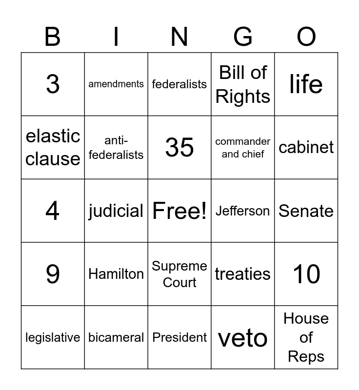 This bingo card has a free space and 29 words: legislative, executive, judicial, Congress, 3, federalists, anti-federalists, Hamilton, Jefferson, bicameral, Senate, House of Reps, President, veto, cabinet, 2/3, Supreme Court, 9, life, 4, treaties, appoint, commander and chief, elastic clause, Bill of Rights, amendments, 10, 35 and law.