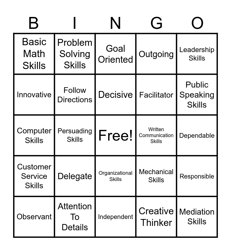 This bingo card has a free space and 34 words: Accountable, Creative Thinker, Motivated, Negotiating Skills, Customer Service Skills, Follow Directions, Leadership Skills, Observant, Problem Solving Skills, Coaching/Mentoring Skills, Decisive, Goal Oriented, Listening Skills, Oral Communication Skills, Written Communication Skills, Public Speaking Skills, Attention To Details, Computer Skills, Delegate, Mechanical Skills, Organizational Skills, Punctual, Basic Math Skills, Dependable, Independent, Mediation Skills, Outgoing, Calm, Facilitator, Innovative, Money Skills, Persuading Skills, Responsible and Understanding.