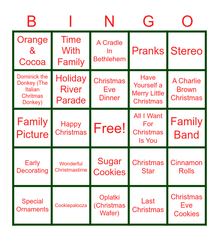 This bingo card has a free space and 35 words: Christmas Morning Nachos, Christmas Outfits, German Christmas, Holiday River Parade, Sugar Cookies, Pranks, Dominick the Donkey (The Italian Chritmas Donkey), Christmas Eve Mass, Christmas Eve Dinner, Botanical Gardens Lightscapes, Family Picture, Stereo, Sleigh Ride, Botanical Gardens Lightscapes, Orange & Cocoa, All I Want For Christmas Is You, Last Christmas, Happy Christmas, Early Decorating, Christmas Eve Cookies, Christmas Star, Special Ornaments, Cinnamon Rolls, Cookiepalooza, A Cradle In Bethlehem, A Charlie Brown Christmas, Rudolph the Red-Nosed Reindeer, Zoo Lights, Have Yourself a Merry Little Christmas, Family Band, Christmas Cookies, Oplatki (Christmas Wafer), Wonderful Christmastime, Time With Family and Buda Trail of Lights.