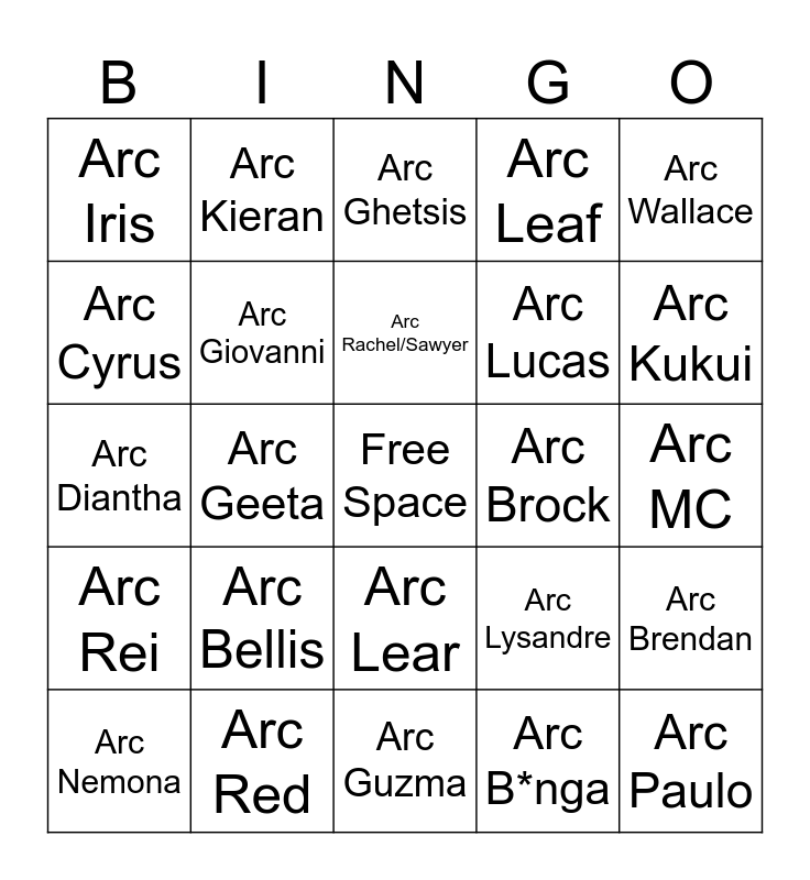 This bingo card has a free space and 24 words: Arc Bellis, Arc Red, Arc Rachel/Sawyer, Arc Nemona, Arc Wallace, Arc Iris, Arc Cyrus, Arc Kieran, Arc Brock, Arc Lear, Arc Lucas, Arc Diantha, Arc Lysandre, Arc Brendan, Arc Giovanni, Arc B*nga, Arc MC, Arc Ghetsis, Arc Kukui, Arc Geeta, Arc Paulo, Arc Rei, Arc Leaf and Arc Guzma.