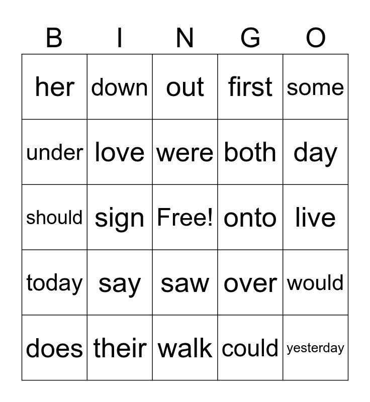 This bingo card has a free space and 24 words: say, their, were, does, some, her, under, down, onto, saw, both, should, over, would, love, could, live, out, day, sign, yesterday, today, first and walk.