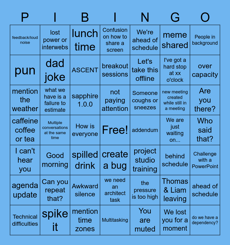 This bingo card has a free space and 55 words: You are muted, Are you there?, This has been a tough year, feedback/loud noise, Multiple conversations at the same time, Can you repeat that?, People in background, Can you see my screen?, dad joke, Awkward silence, Confusion on how to share a screen, Challenge with a PowerPoint, Who said that?, We are just waiting on..., Technical difficulties, I can't hear you, We're ahead of schedule, Let's take this offline, We lost you for a moment, I've got a hard stop at xx o'clock, over capacity, Good morning, Someone coughs or sneezes, lunch time, I don't know how to Chat, pun, How is everyone, new feature created, mention the weather, new meeting created while still in a meeting, inaccessible link, behind schedule, ahead of schedule, spike it, meme shared, breakout sessions, agenda update, what we have is a failure to estimate, do we have a dependency?, spilled drink, lost power or interwebs, we need an architect task, the pressure is too high, Smithfield, sapphire 1.0.0, caffeine coffee or tea, mention time zones, project studio training, addendum, ASCENT, create a bug, Thomas & Liam leaving, Multitasking, not paying attention and eating or drinking noises.