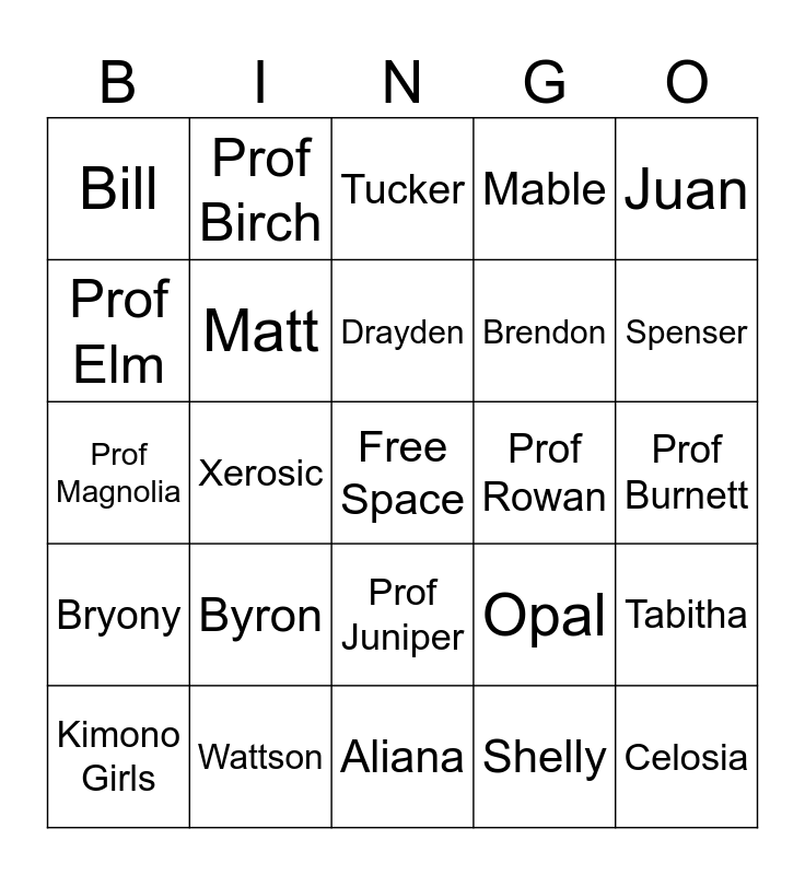 This bingo card has a free space and 24 words: Byron, Wattson, Drayden, Kimono Girls, Juan, Bill, Prof Elm, Prof Birch, Prof Rowan, Prof Juniper, Brendon, Prof Magnolia, Opal, Tabitha, Matt, Shelly, Prof Burnett, Tucker, Spenser, Xerosic, Celosia, Bryony, Mable and Aliana.