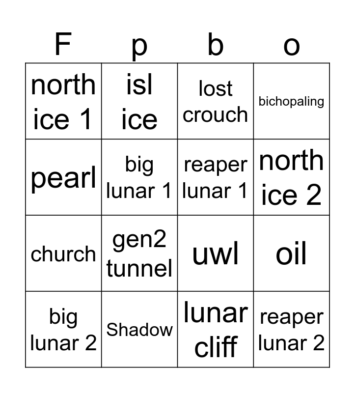 This bingo card has 16 words: Shadow, oil, lost crouch, north ice 1, church, isl ice, uwl, lunar cliff, pearl, big lunar 1, big lunar 2, bichopaling, gen2 tunnel, north ice 2, reaper lunar 1 and reaper lunar 2.