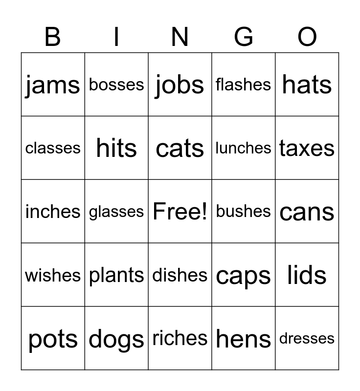 This bingo card has a free space and 24 words: plants, dogs, cats, pots, hats, jams, classes, bosses, bushes, dishes, lunches, inches, caps, lids, hits, hens, cans, jobs, taxes, glasses, dresses, wishes, flashes and riches.
