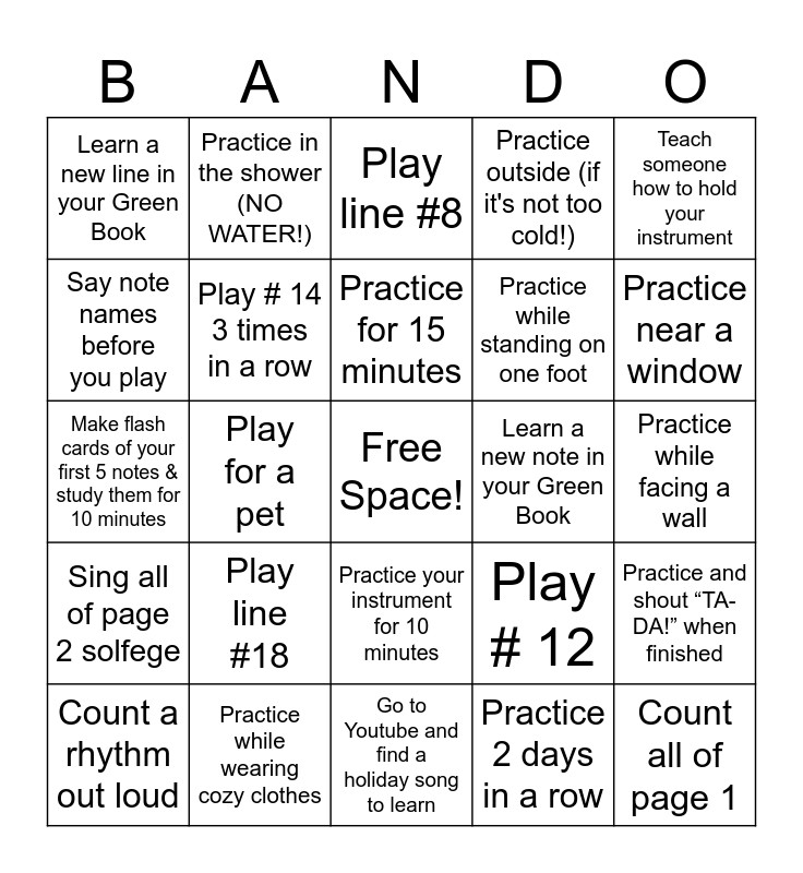This bingo card has a free space and 24 words: Play line #18, Practice while wearing cozy clothes, Practice for 15 minutes, Count a rhythm out loud, Teach someone how to hold your instrument, Learn a new line in your Green Book, Say note names before you play, Practice in the shower (NO WATER!), Learn a new note in your Green Book, Practice your instrument for 10 minutes, Practice while standing on one foot, Make flash cards of your first 5 notes & study them for 10 minutes, Play # 12, Practice and shout “TA-DA!” when finished, Play # 14 3 times in a row, Practice 2 days in a row, Practice while facing a wall, Play line #8, Practice near a window, Play for a pet, Count all of page 1, Sing all of page 2 solfege, Practice outside (if it's not too cold!) and Go to Youtube and find a holiday song to learn.