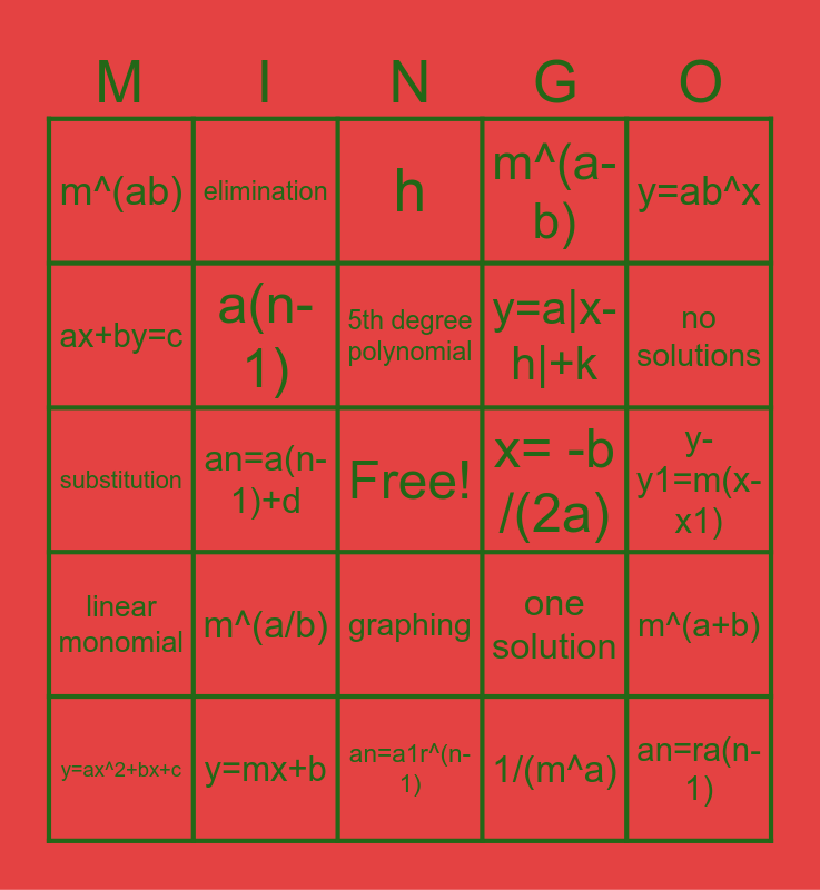 This bingo card has a free space and 30 words: Quadratic Binomial, y=mx+b, h, an=a1+(n-1)d, y=ab^x, m^(ab), a(n-1), 5th degree polynomial, y=a|x-h|+k, an=ra(n-1), y=ax^2+bx+c, m^(a/b), 1/(m^a), a, linear monomial, k, an=a1r^(n-1), x= -b /(2a), m^(a+b), ax+by=c, an=a(n-1)+d, cubic trinomial, m^(a-b), y-y1=m(x-x1), substitution, elimination, graphing, one solution, no solutions and infinite solutions.