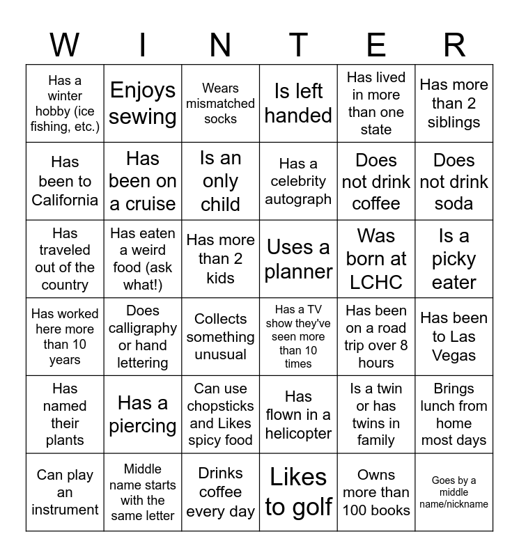This bingo card has 59 words: Makes their own bread, Has a TV show they've seen more than 10 times, Has a food allergy or unique diet, Uses a planner, Has been to Las Vegas, Has been to New York City, Has been to California, Has been to Florida, Is an only child, Can speak another language, Is left handed, Someone who went to a different school than you, Has more than 2 siblings, Can play an instrument, Likes winter more than summer, Has a winter hobby (ice fishing, etc.), Has traveled out of the country, Has lived in more than one state, Has succeeded at an escape room, Has been on a cruise, Has eaten a weird food (ask what!), Wears mismatched socks, Collects something unusual, Does calligraphy or hand lettering, Never broken a bone, Middle name starts with the same letter, Is a twin or has twins in family, Named after a family member, Has a celebrity autograph, Likes to golf, Does not have Facebook, Has the same zodiac sign as you, Plants a garden, Has a gym membership, Enjoys sewing, Has a piercing, Has a tattoo, Does not drink soda, Drinks coffee every day, Does not drink coffee, Has an account on 5+ social media platforms, Was born at LCHC, Has more than 2 kids, Was part of a sorority/fraternity, Has flown in a helicopter, Was not born in Iowa, Has built a snowman this winter, Has a birthmark, Is a picky eater, Has been on a road trip over 8 hours, Has moved more than 3 times, Goes by a middle name/nickname, Can use chopsticks and Likes spicy food, Brings lunch from home most days, Owns more than 100 books, Has worked here more than 10 years, Knows a coworkers birthday by heart, Has named their plants and Is in a book club.