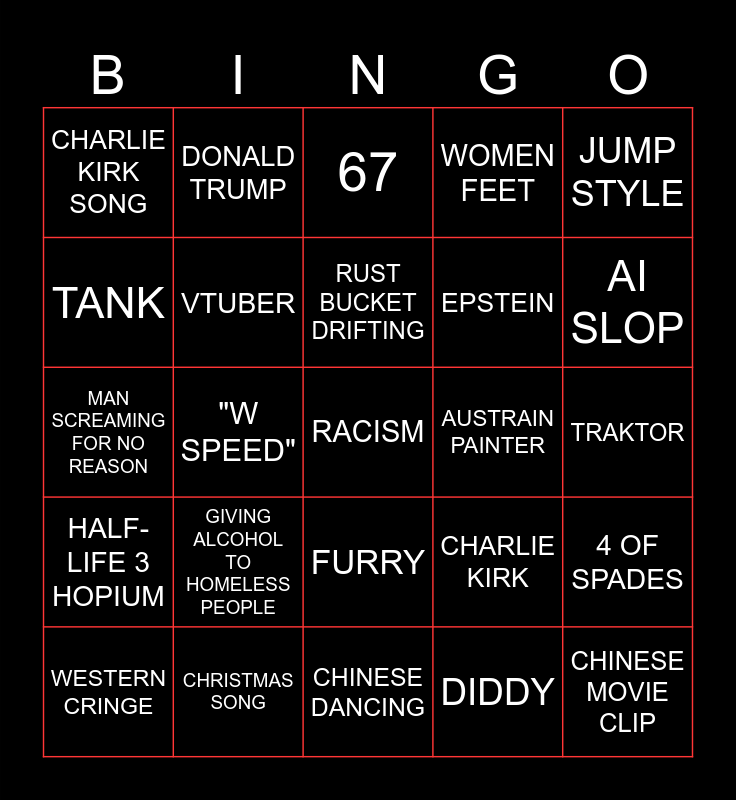 This bingo card has a free space and 24 words: GIVING ALCOHOL TO HOMELESS PEOPLE, CHRISTMAS SONG, RUST BUCKET DRIFTING, WESTERN CRINGE, JUMP STYLE, CHARLIE KIRK SONG, TANK, DONALD TRUMP, AUSTRAIN PAINTER, FURRY, EPSTEIN, MAN SCREAMING FOR NO REASON, CHARLIE KIRK, 4 OF SPADES, VTUBER, DIDDY, TRAKTOR, 67, AI SLOP, "W SPEED", CHINESE MOVIE CLIP, HALF-LIFE 3 HOPIUM, WOMEN FEET and CHINESE DANCING.