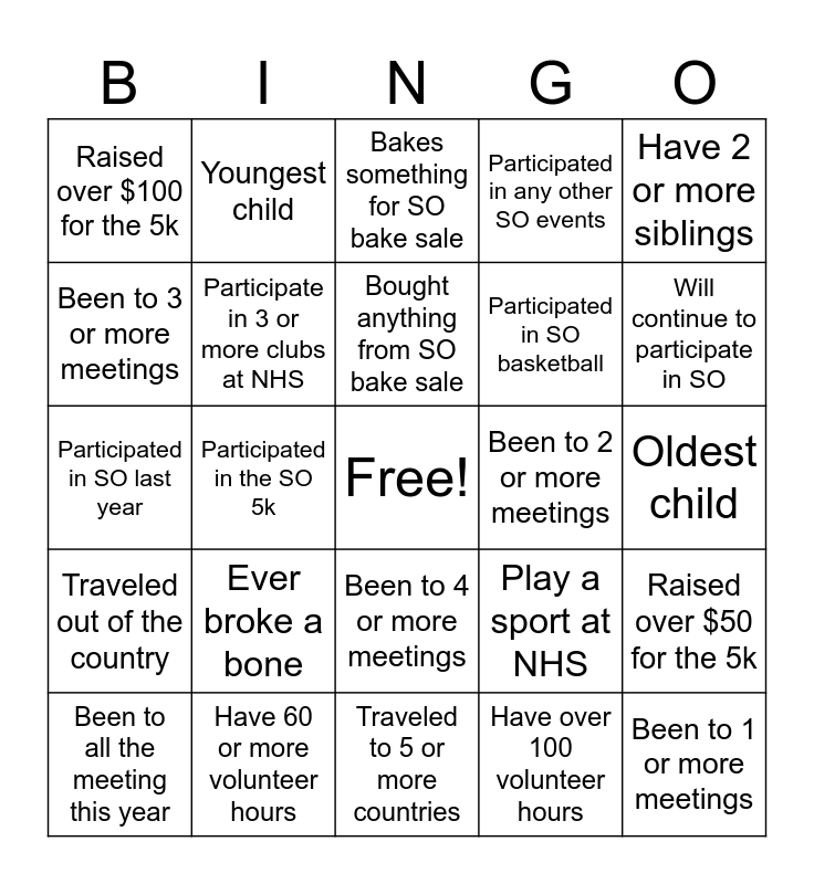 This bingo card has a free space and 24 words: Ever broke a bone, Have 60 or more volunteer hours, Bought anything from SO bake sale, Been to all the meeting this year, Have 2 or more siblings, Raised over $100 for the 5k, Been to 3 or more meetings, Youngest child, Been to 2 or more meetings, Been to 4 or more meetings, Participated in SO basketball, Participated in SO last year, Play a sport at NHS, Raised over $50 for the 5k, Participate in 3 or more clubs at NHS, Have over 100 volunteer hours, Oldest child, Bakes something for SO bake sale, Will continue to participate in SO, Participated in the SO 5k, Been to 1 or more meetings, Traveled out of the country, Participated in any other SO events and Traveled to 5 or more countries.