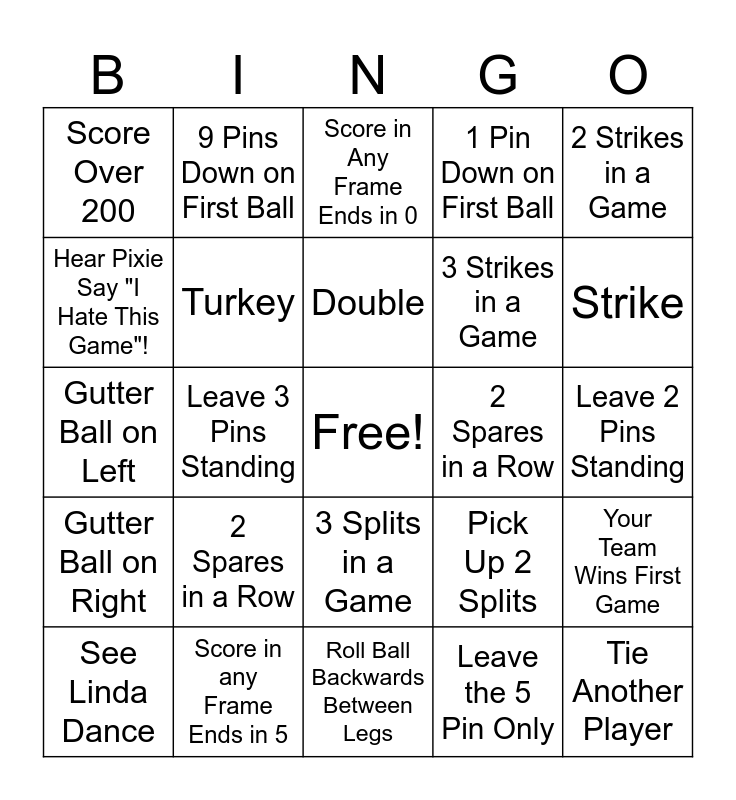 This bingo card has a free space and 24 words: 2 Spares in a Row, Score in any Frame Ends in 5, Double, See Linda Dance, 2 Strikes in a Game, Score Over 200, Hear Pixie Say "I Hate This Game"!, 9 Pins Down on First Ball, 2 Spares in a Row, 3 Splits in a Game, 3 Strikes in a Game, Gutter Ball on Left, Pick Up 2 Splits, Your Team Wins First Game, Turkey, Leave the 5 Pin Only, Leave 2 Pins Standing, Score in Any Frame Ends in 0, Strike, Leave 3 Pins Standing, Tie Another Player, Gutter Ball on Right, 1 Pin Down on First Ball and Roll Ball Backwards Between Legs.