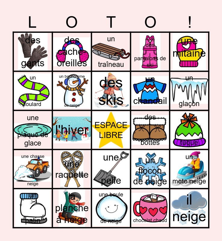 This bingo card has 24 images, a free space and 24 words: une raquette, la planche à neige, des skis, un patin, une mitaine, des gants, un foulard, des cache-oreilles, des bottes, une pelle, un chandail, une plaque de glace, un flocon de neige, un moto neige, un bonhomme de neige, un chocolat chaud, une tuque, un traîneau, un glaçon, l'hiver, il neige, une chasse neige, des pantalons de ski and une boule de neige.