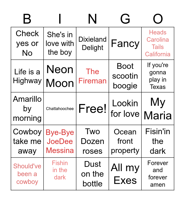 This bingo card has a free space and 24 words: Bye-Bye JoeDee Messina, Fishin in the dark, The Fireman, Should've been a cowboy, Heads Carolina Tails California, Check yes or No, Life is a Highway, She's in love with the boy, Lookin for love, Two Dozen roses, Boot scootin boogie, Amarillo by morning, Ocean front property, Fisin'in the dark, Neon Moon, All my Exes, My Maria, Dixieland Delight, If you're gonna play in Texas, Chattahoochee, Forever and forever amen, Cowboy take me away, Fancy and Dust on the bottle.